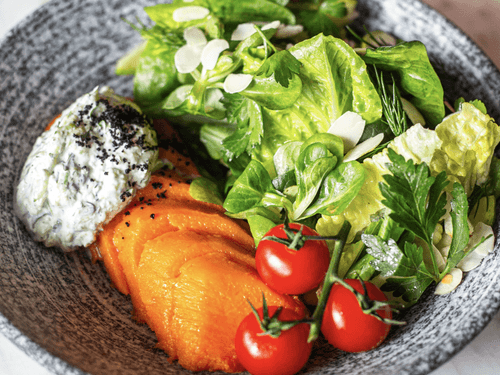 Салат с запеченным бататом и дзадзыки, разработанный шеф-поваром Марией Горячевой из ресторана «Полет», представляет собой гармоничное сочетание вкусов и текстур. Теплый сладкий картофель прекрасно дополняется освежающим соусом на основе сметаны и огурцов, создавая контраст между температурой и вкусом. Кажется, что зеленый салат существует на тарелке сам по себе, но на самом деле все его компоненты идеально дополняют друг друга: хрустящие миндальные лепестки, сочная нежность батата и яркая зелень, которая придает блюду свежесть. Это не просто салат, а полноценное и самостоятельное угощение, в котором не требуется дополнений в виде мяса или гарнира.