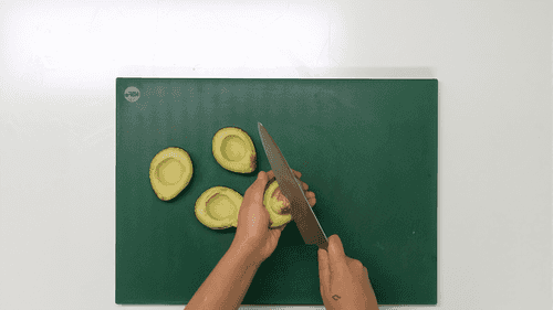 Авокадо разрезать пополам вдоль, избавить от косточки и кожуры. Нарезать тонкими ломтиками.