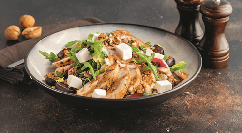 Салат с куриной грудкой и виноградом — элегантное сочетание простых ингредиентов, которое дарит удивительное гастрономическое удовольствие. Этот салат имеет европейские корни и воплощает баланс свежести, сочности и пикантных нот. Сочная куриная грудка, нежно пропитанная ароматами тимьяна и оливкового масла, гармонично сочетается с кисло-сладкими ягодами винограда. Добавление грецких орехов придаёт блюду хрустящую текстуру, а фета с его солоноватым вкусом завершает вкусовую композицию. Заправка из меда, бальзамического уксуса и дижонской горчицы обогащает блюдо сладкой глубиной и мягкой кислинкой. Этот салат прекрасно подходит как легкий обед или изысканная закуска на праздничном столе. Он не только радует вкусом, но и украшает тарелку своей яркостью и контрастами.