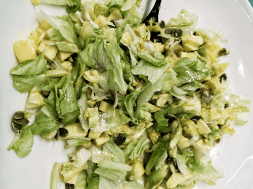 Выложить на дно миски тыквенные семена, сверху уложить рваные листья салата айсберг и залить ароматным маслом.