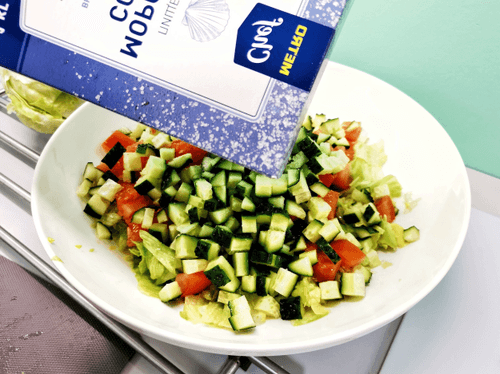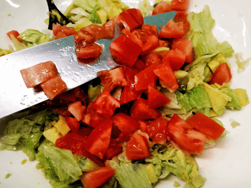 Нарезать помидоры кубиками и отправить к салату.