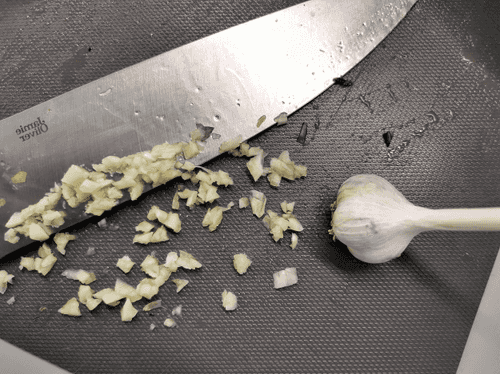 Мелко нарубить чеснок и отправить его к остальным овощам.