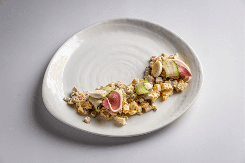 Оливье с копченым языком и трюфельным маслом