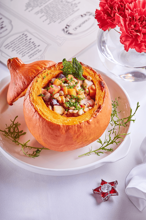 Заправить салат. Подавать в тарелке или в печеной тыкве.