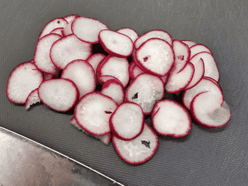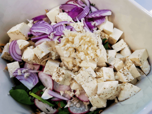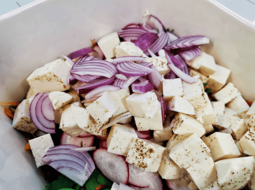 Адыгейский сыр нарезать кубиками и приправить черным перцем.