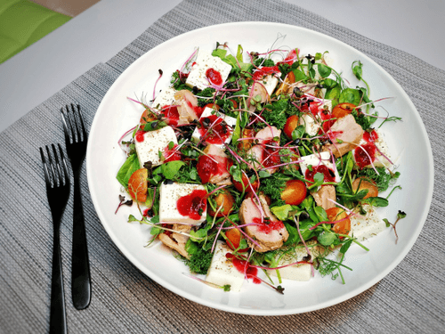 Салат из варено-копченой утки с сыром сулугуни — это гармония вкусов и текстур. Нежное, ароматное мясо утки сочетается с упругим, чуть солоноватым сыром сулугуни, создавая богатый и насыщенный вкус. Свежая зелень, айсберг, шпинат и проростки придают блюду лёгкость и хрустящую свежесть, а клюквенный соус добавляет тонкую кислинку и оттеняет мясную основу. Это блюдо воплощает современную авторскую кухню, где традиционные ингредиенты находят новое прочтение. Оно прекрасно подойдёт как для праздничного ужина, так и для лёгкого обеда, удивляя гостей своим изысканным вкусом и элегантной подачей.