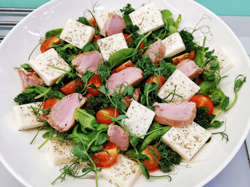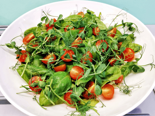 Украсить салат микрозеленью.