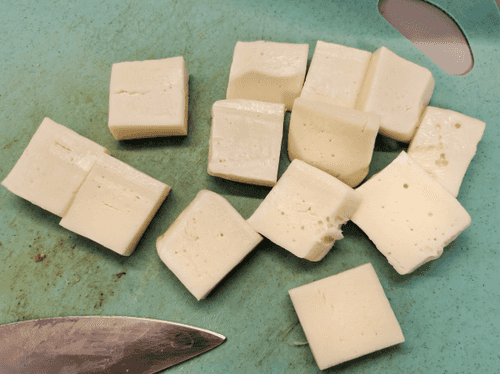 Нарезать сулугуни кубиками.