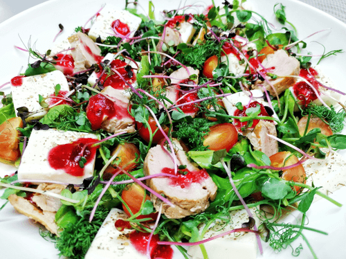Заправить салат клюквенным соусом и украсить микрозеленью.