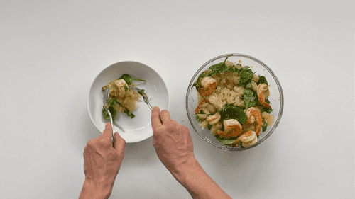 Горячие креветки сразу закинуть в соус. Далее смешать шпинат, листья кинзы и мякоть помело с креветками и соусом.