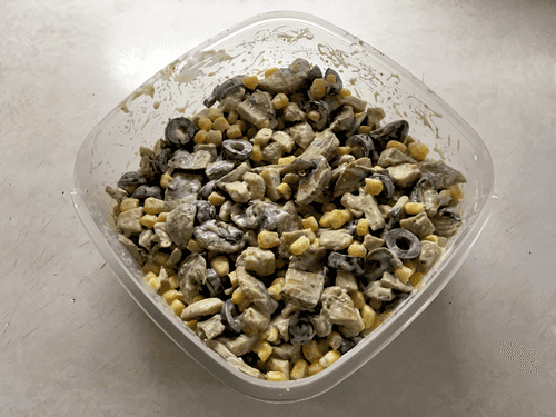 Сытный салат с куриным филе — это гармоничное сочетание нежного мяса, ароматных грибов и пикантных маслин. Это блюдо родом из европейской кухни, где ценится баланс вкусов и текстур. Вкус салата глубокий и насыщенный: куриное филе, обжаренное с хмели-сунели и корицей, придаёт блюду теплые пряные нотки, шампиньоны добавляют землистый аромат, а кукуруза — легкую сладость. Маслины добавляют пикантности, а майонез объединяет все ингредиенты в единую композицию. Этот салат прекрасно подходит как для повседневного ужина, так и для праздничного стола, особенно в качестве сытной холодной закуски. После охлаждения его вкус раскрывается еще больше, превращая обычный обед в гастрономическое удовольствие.