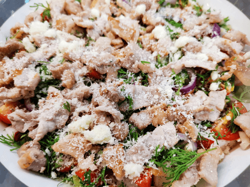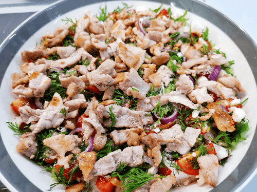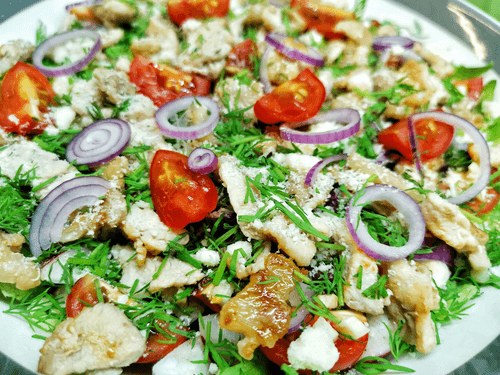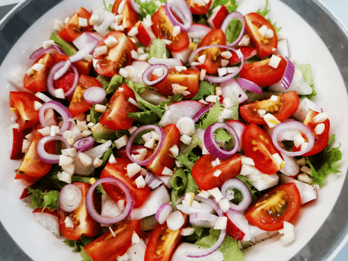 Овощной салат с беконом и пармезаном – это гармония вкусов и текстур, воплощённая в европейской кулинарной традиции. Хрустящие листья фриллиса сочетаются с сочными помидорами черри и редисом, придавая блюду свежесть и легкость. Острый чеснок и пряный укроп добавляют пикантности, а нежные кольца красного лука – тонкую сладость. Хрустящий поджаренный бекон привносит насыщенность, а тертый пармезан – изысканную сливочную нотку. Заправленный душистым маслом, этот салат идеально подходит как легкий обед или оригинальная закуска. Его можно подать с хрустящим хлебом или как гарнир к основным мясным блюдам. Родившись в европейской кухне, он стал любимцем гурманов, ценящих баланс свежести, насыщенности и утонченности вкуса.