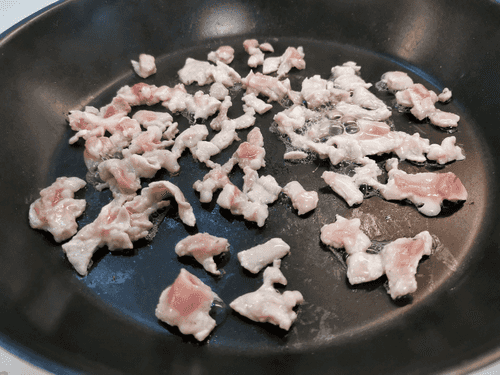 Отправить бекон на сухую раскаленную сковороду и подрумянить с обеих сторон.