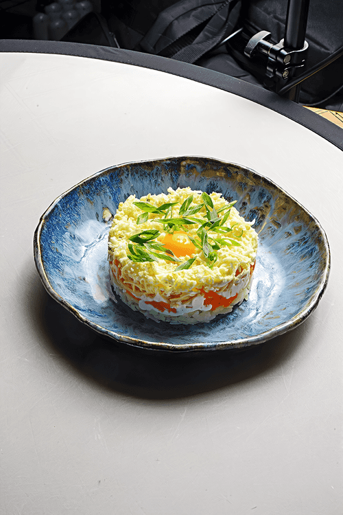 Этот рецепт представляет собой вариацию на тему классической «Мимозы». Вместо консервированной рыбы здесь применяется соленая, что добавляет оригинальности. Также вместо полутвердого сыра используется моцарелла, которая делает блюдо более мягким и нежным. Рецепт был разработан в тверском баре «Суворов».