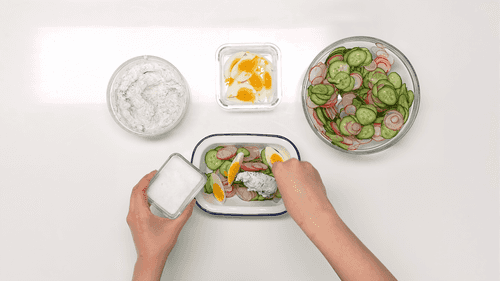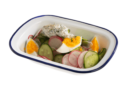 Выложить дольки яиц. Посыпать салат солью и перцем и подавать. Перемешивать салат со сметанной заправкой следует непосредственно перед едой.