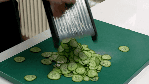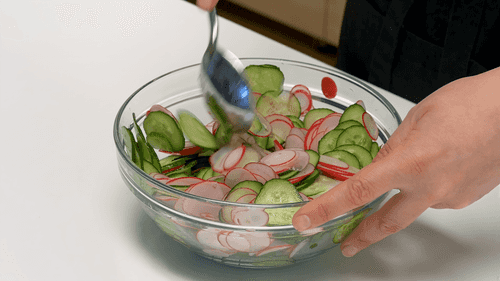 Редиску помыть, срезать вершки и корешки и нарезать ее тонкими кружочками с помощью ножа или мандолины.