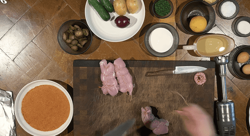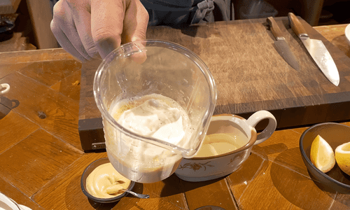 Приготовить домашний майонез (он готовится за минуту, поэтому заранее это делать не нужно). В высокую узкую емкость или стакан для блендера разбить яйцо. Добавить оливковое масло, сахар, лимонный сок, немного горчицы, соль, перец. Погрузить в смесь выключенный блендер так, чтобы он накрыл яичный желток и доставал до дна. Затем, включив блендер на минимальную скорость (это важно!), начать медленно поднимать его вверх, так, чтобы он прошел всю толщу будущего соуса примерно за 30 секунд. Но ни в коем случае не вынимать блендер из соуса. В конце, когда майонез достаточно загустеет, будет характерный звук, похожий на шлепок.