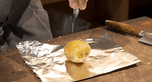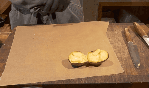 Достать готовый картофель из углей или духовки, остудить так, чтобы терпела рука. Счистить гарь и самые глубокие подпалины, но не очищать от кожуры. Нарезать на шесть-восемь частей.