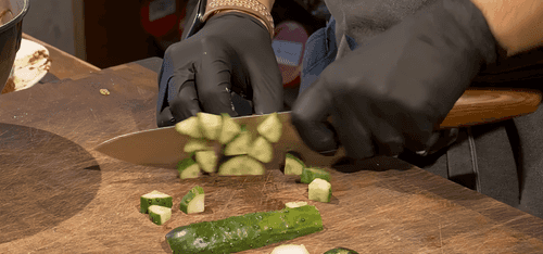 Соленый и свежий огурцы нарезать чуть меньшими кусками, чем индейку.