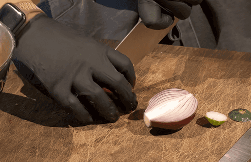 Красный лук разрезать на шесть частей и тонко нашинковать.