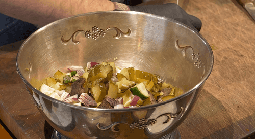 Соединить ингредиенты для салата — нарезанную картошку в мундире, красный лук, соленый и свежий огурец — в большой миске, заправить майонезом, можно добавить еще горчицы, если любите поострее. И хорошенько перемешать салат руками, как будто вы месите тесто.
