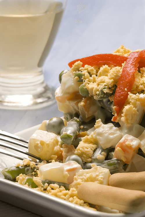 Оливье по-генделевски – это изысканный вариант классического салата, имеющий французский колорит. В нем сочетаются нежное мясо курицы, телятины и копченой индейки, которые придают блюду глубину вкуса. Кисловатая нотка моченой антоновки гармонично подчеркивает пикантность дижонской горчицы и лимонного майонеза. Легкая свежесть маринованных огурцов и сладкого перца дополняет богатую текстуру, а анчоусы завершают композицию тонким солоноватым акцентом. Этот салат – настоящее гастрономическое произведение, подходящее как для праздничного застолья, так и для изысканного ужина. Его подача на хрустящих листьях салата делает блюдо еще более эстетичным, а охлаждение перед подачей усиливает его вкусовые контрасты.