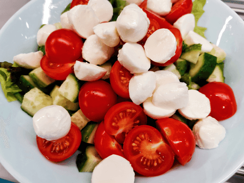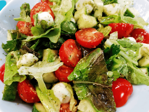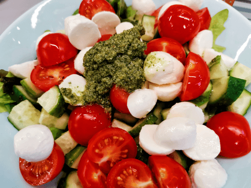 Классический салат с моцареллой и соусом песто — это воплощение итальянской гастрономической простоты и элегантности. Его история уходит корнями в Средиземноморскую кухню, где свежие ингредиенты играют главную роль. Салат айсберг и петрушка создают хрустящую зелёную основу, а огурцы и помидоры черри добавляют свежесть и сочность. Шарики нежной мини-моцареллы придают блюду мягкость и молочный вкус, который прекрасно дополняется ароматным соусом песто. Этот салат идеально подходит как лёгкая закуска или гарнир к основным блюдам, его можно подавать на праздничный стол или наслаждаться им в повседневной трапезе. Изысканный, но лёгкий, он восхищает балансом вкусов и оттенков.