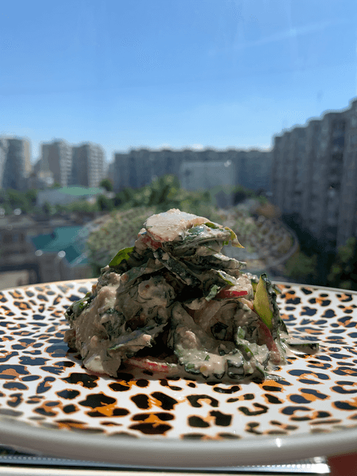 Салат из зелени с ореховой заправкой — это воплощение свежести и насыщенного вкуса. Вдохновленный натуральными ингредиентами, он объединяет хрустящую зелень, сочные овощи и нежную кремовую заправку, богатую ореховым ароматом. Эта комбинация делает блюдо одновременно легким и питательным, идеально подходящим для теплого дня или в качестве изысканной закуски к основному блюду. Ореховая заправка, основанная на грецких орехах, дижонской горчице и соевом соусе, придаёт салату тонкий пикантный оттенок, который раскрывает свежесть зелени. Особенность этого рецепта — его универсальность: он хорошо сочетается с блюдами средиземноморской и авторской кухни. Дайте салату настояться перед подачей, чтобы все ароматы гармонично слились, и наслаждайтесь каждым кусочком этого кулинарного шедевра.