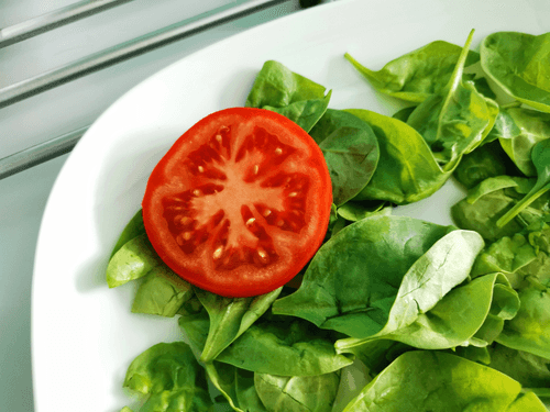 Выложить на зелень кусочек помидора.