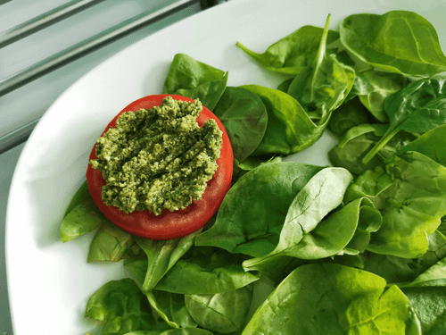 Сверху смазать помидор соусом песто.