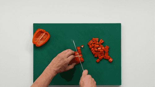 У перца удалить семена и нарезать его кубиком.