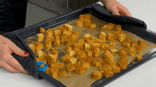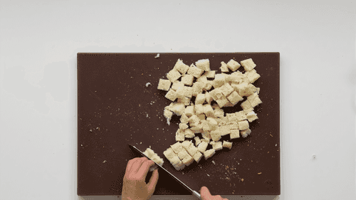Хлеб нарезать крупным кубиком, срезав в него корки.