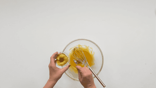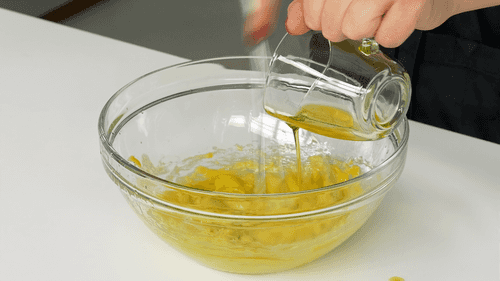 Взбить желток с горчицей и щепоткой соли в глубокой миске.