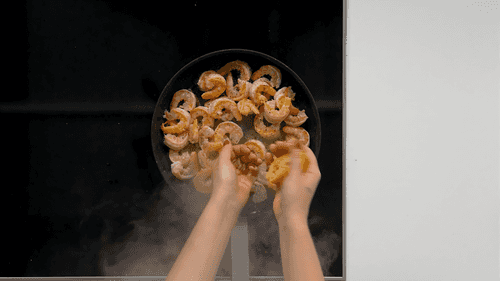 В сковороде разогреть растительное и сливочное масло, добавить зубчик чеснока, обжарить креветки в течение 2–3 минут, посолить и поперчить, в конце сбрызнуть лимонным соком.