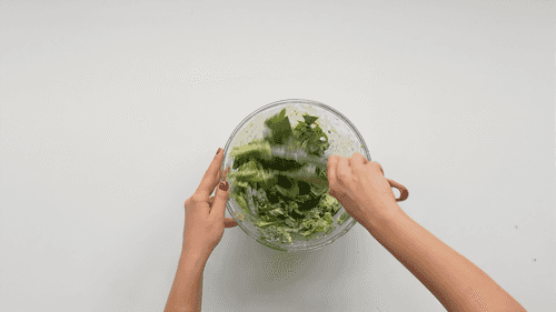 Листья романо порвать на крупные куски, крупные прожилки удалить.