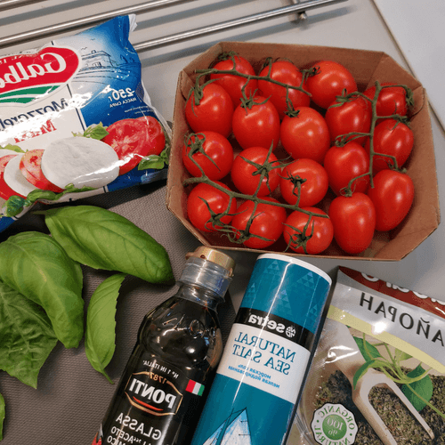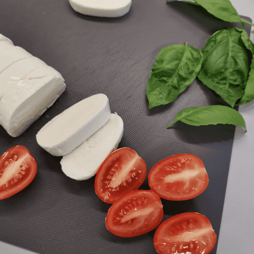 Выкладывать ингредиенты в следующей последовательности: моцарелла, базилик, помидор.
