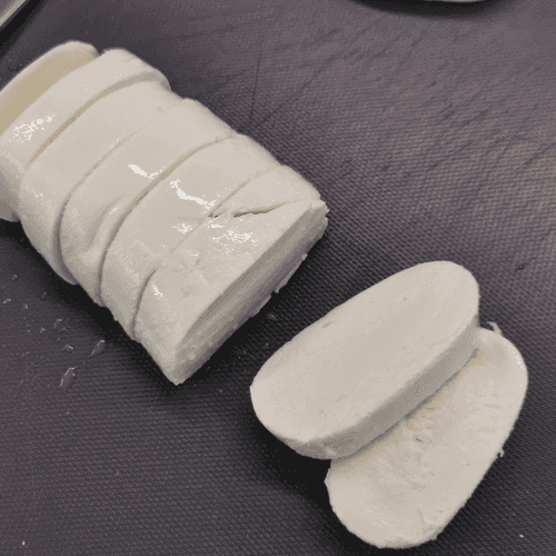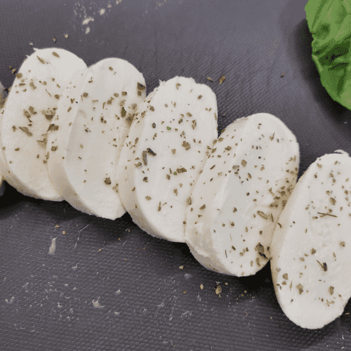 Моцареллу нарезать толстыми слайсами.