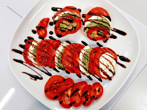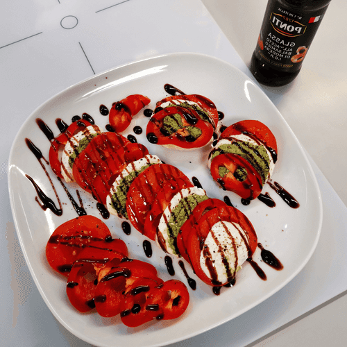 Капрезе с перцем рамиро — это изысканная интерпретация классического итальянского салата, насыщенная ароматами и текстурами. Первоначально капрезе возник на острове Капри, олицетворяя цвета итальянского флага. В этом варианте используется сладкий перец рамиро, который привносит нотку сочности и лёгкой сладости, дополняя свежесть помидоров и нежность моцареллы. Песто добавляет насыщенный базиликовый аромат, а бальзамический крем завершает композицию изысканной кисло-сладкой ноткой. Идеально подходит как лёгкая закуска или элегантное блюдо для праздничного стола. Это сочетание свежести и насыщенности делает капрезе с перцем рамиро особенным гастрономическим наслаждением.