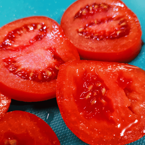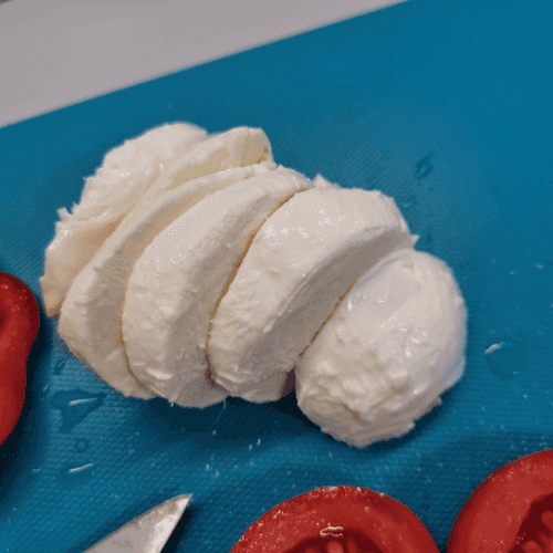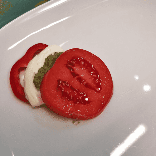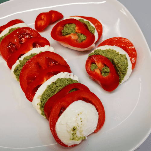 Выложить на блюдо по порядку: рамиро, моцарелла, ложка соуса песто, помидор.