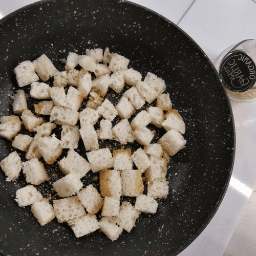 Выложить в оливковое масло на разогретую сковороду кубики хлеба, приправить чесноком и перемешать.