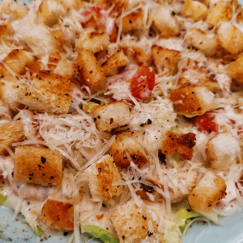 Заправить соусом для салата «Цезарь».