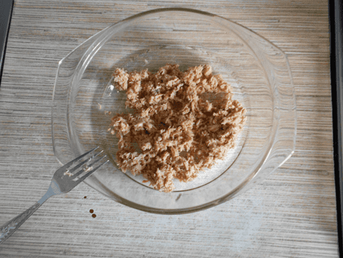 Из банки с тунцом слить жидкость и выложить в миску. Размять тунца вилкой.