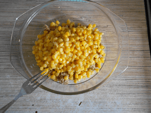 Кукурузу также освободить от жидкости и добавить к тунцу.