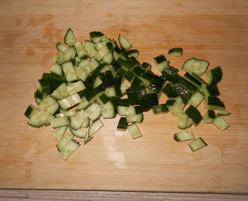 Огурец вымыть и нарезать некрупным кубиком.