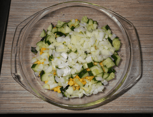 Репчатый лук нарезать так же, некрупным кубиком, и добавить в миску.