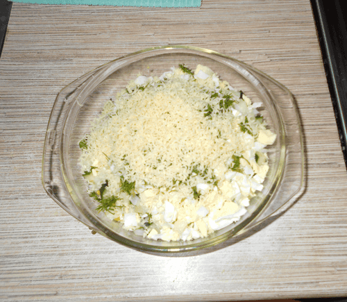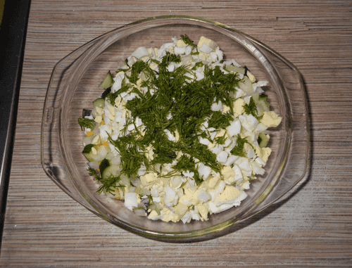Яйца очистить от скорлупы, нарезать не очень мелко и отправить к остальным ингредиентам. Сверху посыпать нарезанным укропом.