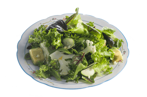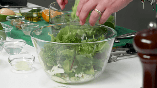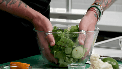 Смешать овощи в большой миске и добавить к ним салатные листья.