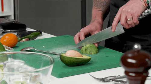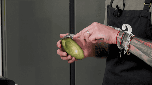 Авокадо разрезать пополам, убрать косточку и с помощью столовой ложки отделить мякоть от кожуры.