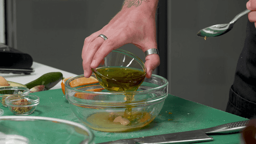 Добавить к цедре сок лимона, сок юдзу, два вида горчицы, оливковое масло и белый бальзамический крем.