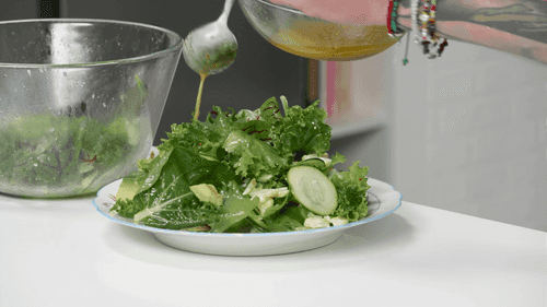 Полить салат заправкой, оставив немного для подачи, и перемешать салат руками, чтобы не помять листья и не сломать овощи.